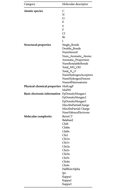 The chosen molecular descriptors(features) are generally classified into 5 classes: